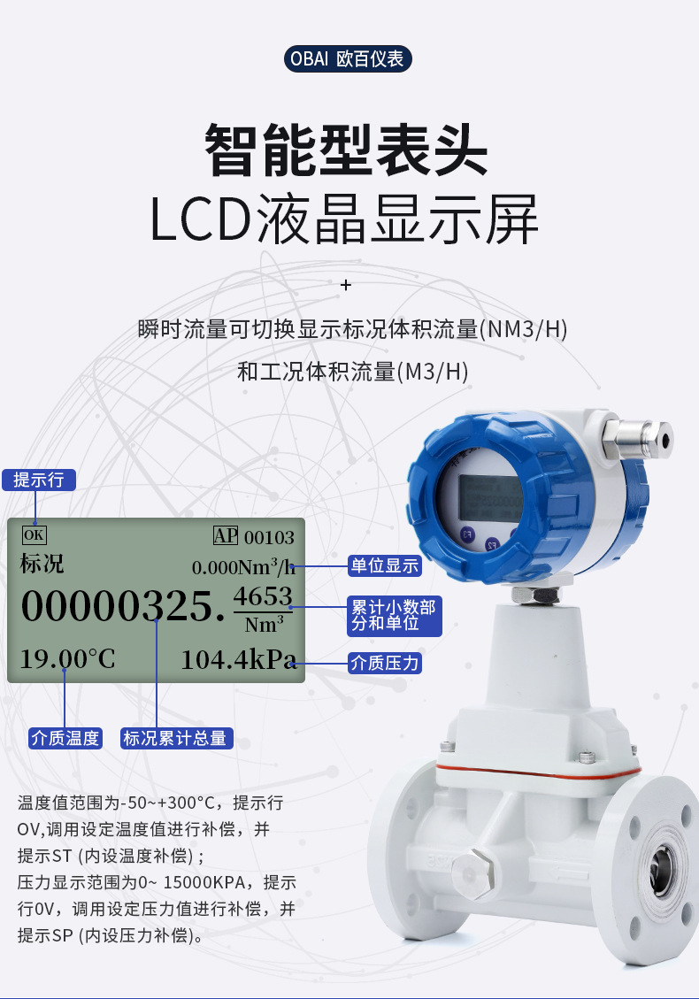 OBLUXB 系列旋進(jìn)旋渦流量計(jì)是用于精準(zhǔn)測(cè)量氣體介質(zhì)流量的一種速度式流量計(jì),具有計(jì)量精度高、重復(fù)性好、測(cè)量范圍寬、安裝簡(jiǎn)單、維護(hù)方便、使用壽命長(zhǎng)、操作使用方便等優(yōu)點(diǎn)。并且儀表考慮到氣體的可壓縮性,體積量與介質(zhì)溫度、壓力的變化將工況流量直接轉(zhuǎn)化為標(biāo)況流量,保證測(cè)量的準(zhǔn)確性。